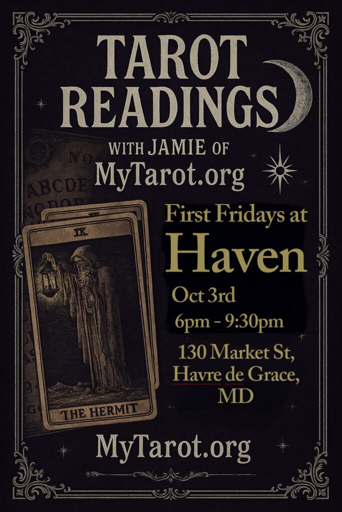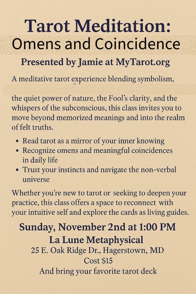 - Nov. 8th – Tarot class “Tarot Foundations: An intuitive Introduction and More… 4pm to 7pm. Link: https://www.facebook.com/share/1AXAA2Y5CD/